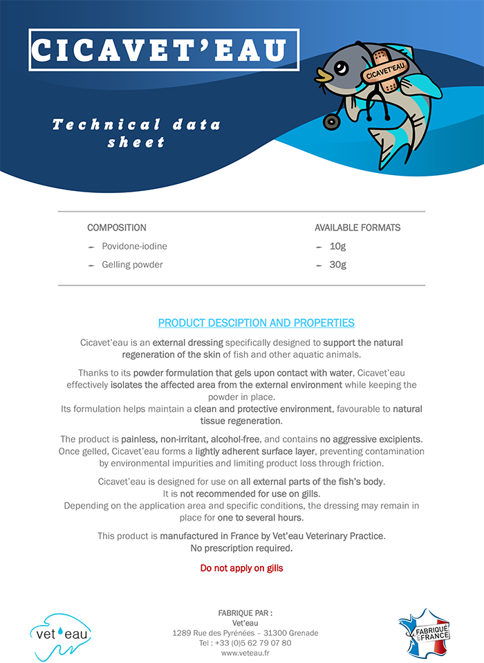Our practice offers a range of products specifically designed to meet the unique needs of fish. Among them, Mélange Vitalité, a feed additive that promotes well-being, Cicavet’eau, an effective healing agent and Quaterna® Aqua, a product that enhances water quality, revitalizes sediments, and prevents bacterial issues in aquaculture.